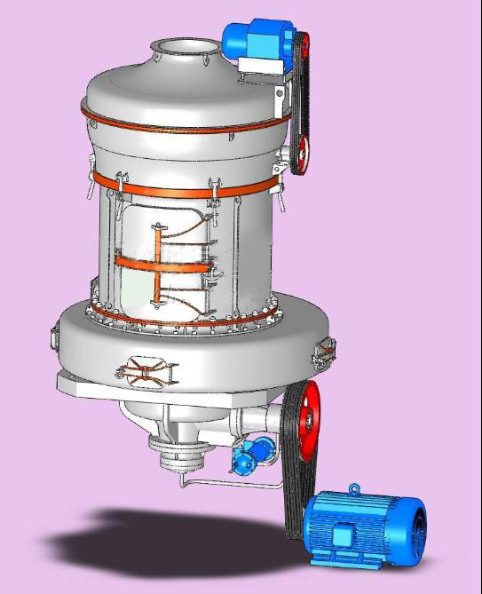 歐版磨粉機的主機工作過程是:通過錐齒輪整體傳動裝置帶動中心軸轉(zhuǎn)動,軸的上端聯(lián)結(jié)著磨輥吊架,架上裝有磨輥裝置并形成擺動支點。磨輥裝置不僅圍繞中心軸回轉(zhuǎn),還圍繞著磨環(huán)公轉(zhuǎn),磨輥本身因摩擦作用而自轉(zhuǎn)。磨輥吊架下裝有鏟刀,其位置處于磨輥下端,鏟刀與磨輥同轉(zhuǎn)過程中把 物料拋起喂入磨輥磨環(huán)之間,形成墊料層,該料層受磨輥旋轉(zhuǎn)產(chǎn)生向外的離心力(即擠壓力)將物料碾碎,由此而達到制粉目的。