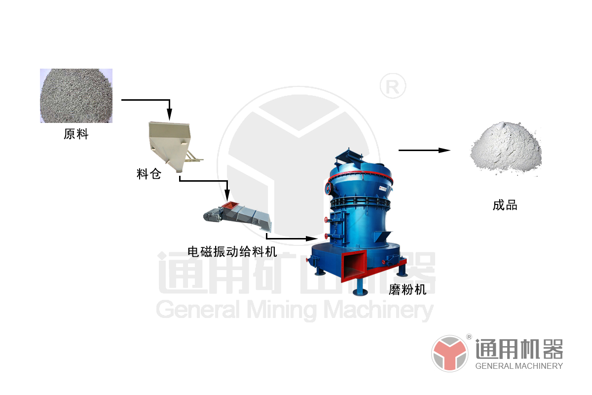 物料由鏟車進料到原料倉,原料倉的料再由下端的自動給料機,輸送至YGM85主機進行粉磨,成品由集粉器送至打包機打包。